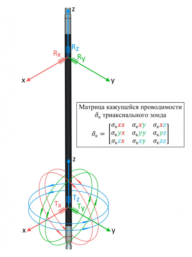 Зонды трехкомпонентного индукционного каротажа дополнительно включают катушки, оси которых совпадают с осями X (красная) и Y (зеленая). Эти катушки и генерируют токи, протекающие по круговым контурам с центрами на этих осях в плоскостях, перпендикулярных этим осям. Вторичные токи в среде, индуцированные x-, y- и z-компонентами генераторных катушек возбуждают сигналы в аналогичных x-, y- и z- компонентах приемников. Разделение по времени как генерации, так и измерений позволяет регистрировать полную матрицу кажущихся проводимостей триаксиальных зондов. В вертикальных скважинах со строго горизонтально ориентированными слоями вся информация содержится в диагональных элементах матрицы , причем , а все недиагональные элементы матрицы равны нулю. В анизотропных пластах, имеющих наклон либо пересеченных наклонными скважинами, все элементы матрицы кажущихся проводимостей не равны нулю и содержат информацию о пластах.