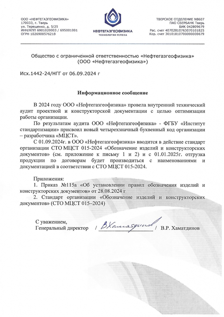 С 01.09.2024 г в ООО "Нефтегазгеофизика" вводится в действие стандарт организации СТО МЦСТ 015-2024 "Обозначение изделий и конструкторских документов", в связи с чем, отгрузка продукции по договорам будет производиться с наименованиями и документацией в соответствии с СТО МЦСТ 015-2024.