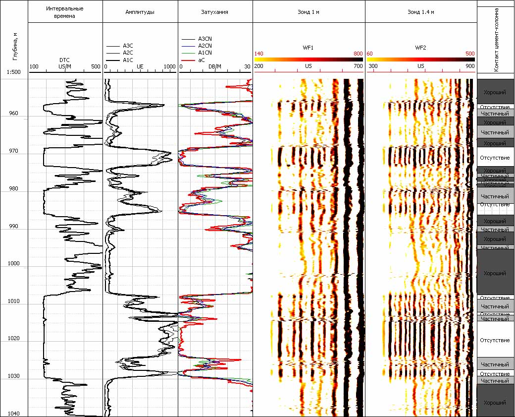 - определение интервалов с отсутствием, частичным и хорошим сцеплением колонны и цемента, выделение интервалов с отсутствием сцепления цемента с породой.