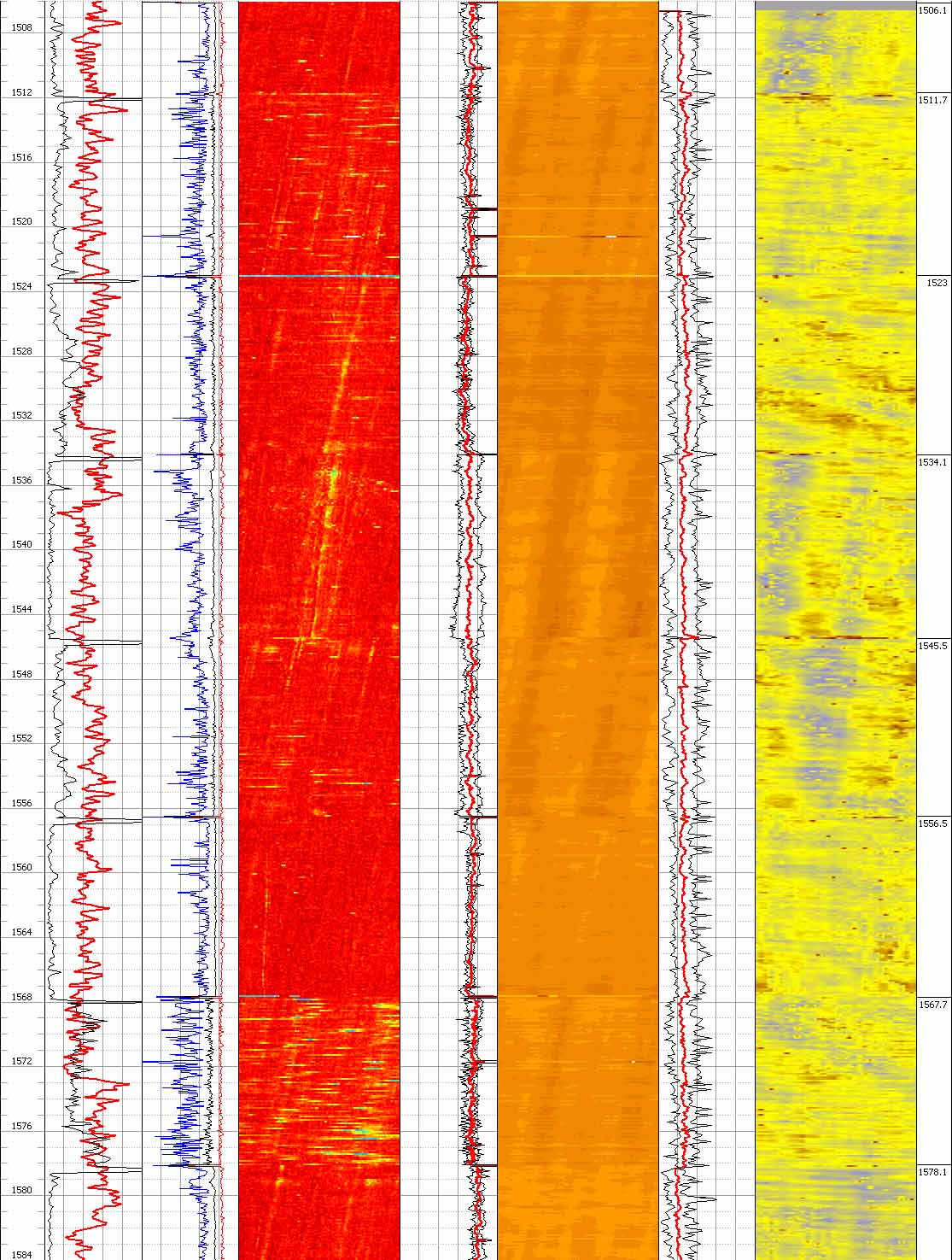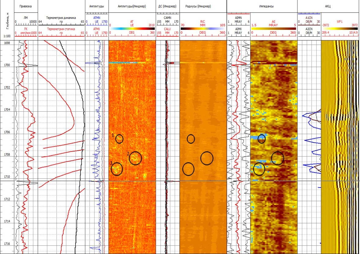 - построение разверток акустического импеданса с радиальным определением качества сцепления колонны с цементом;