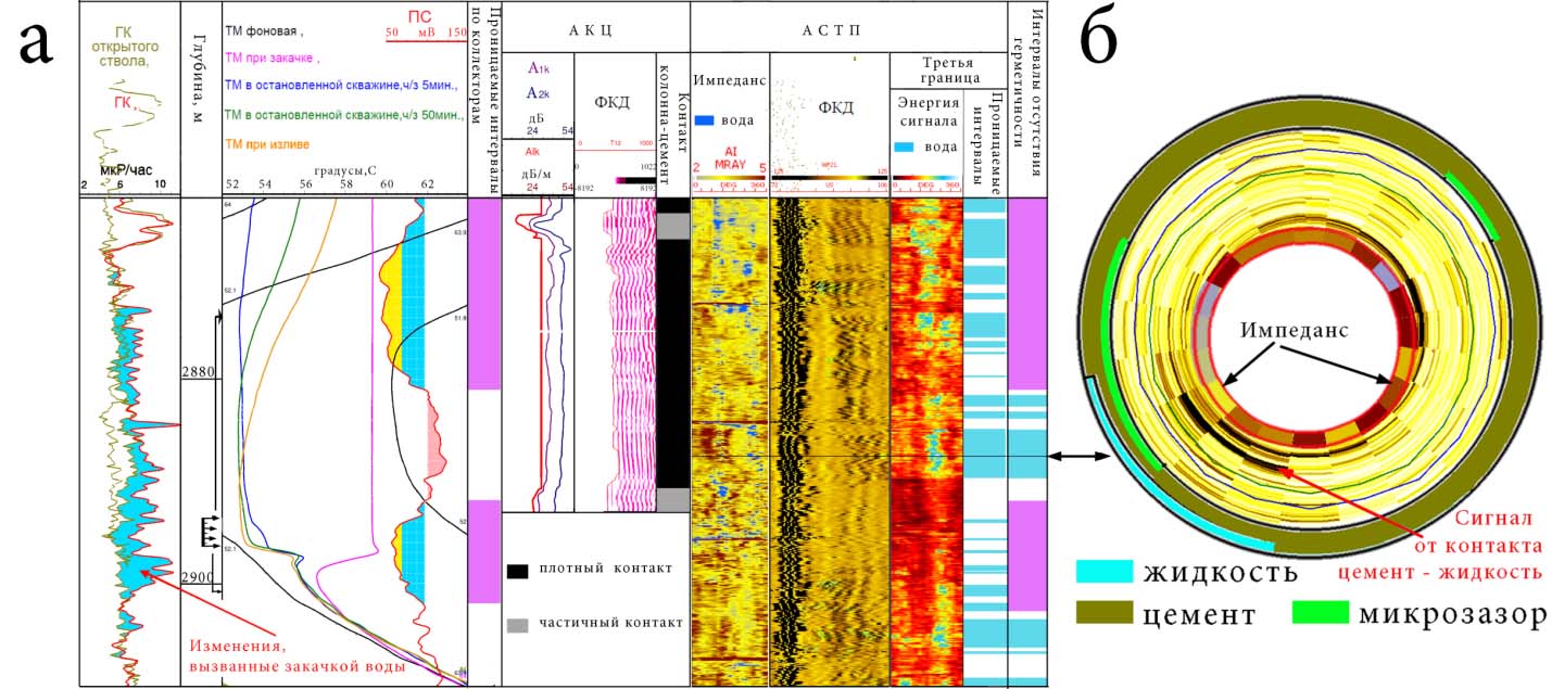 Рис.1.16. Переток жидкости в нагнетательной скважине. По результатам обработки стандартного АКЦ и АСТ перемычка между коллекторами герметична. Наличие отражающей границы (а) за цементом контактирующим с обсадной колонной, выявленный по данным АСТП, свидетельствует о канале перетока флюида между коллекторами.б — круговая развертка зарегистрированных прибором АСТП в интервале перетока данных. Синим кругом отмечено время прихода волны при заполнении затрубного пространства жидкостью, зеленым кругом — при заполнении затрубного пространства цементом.