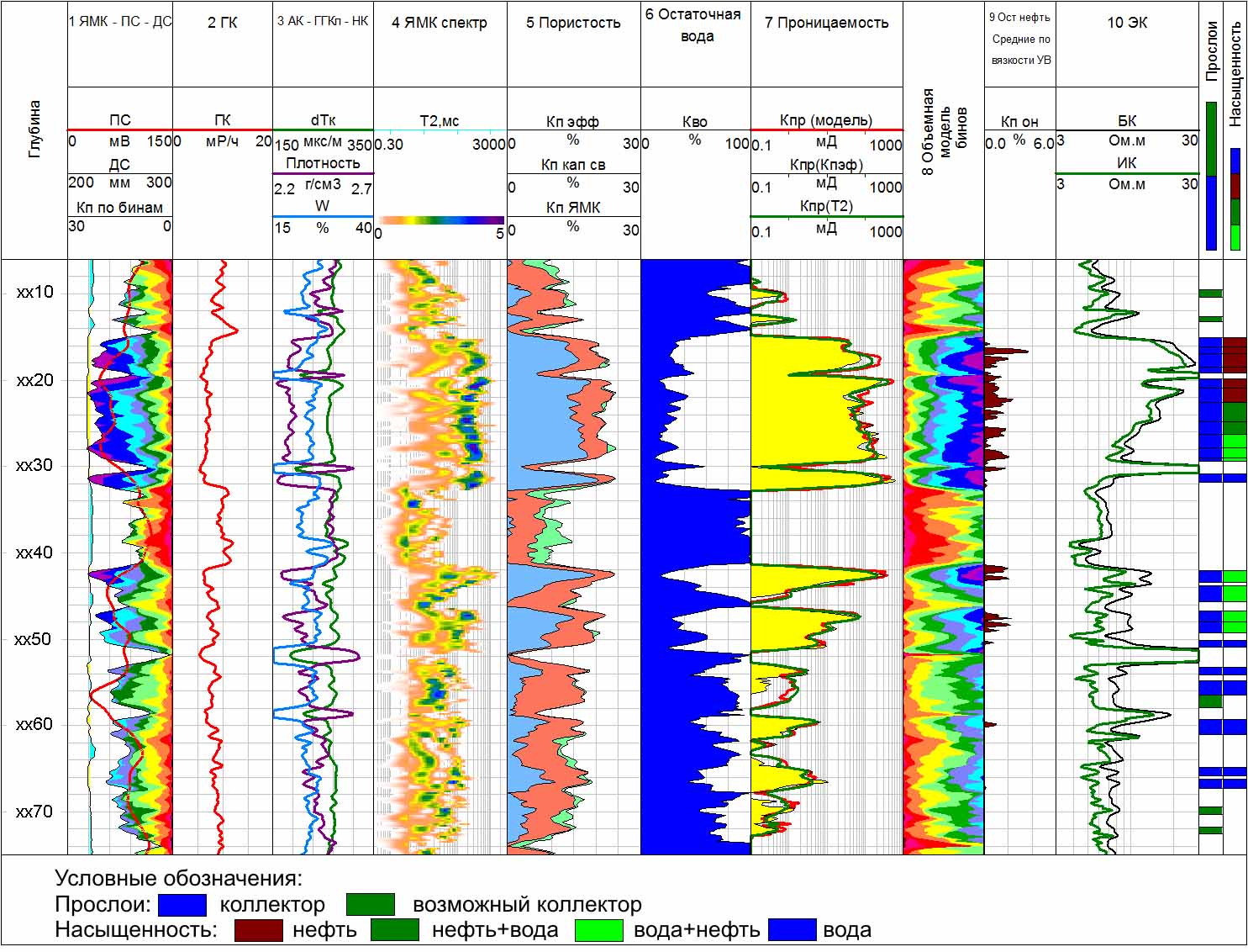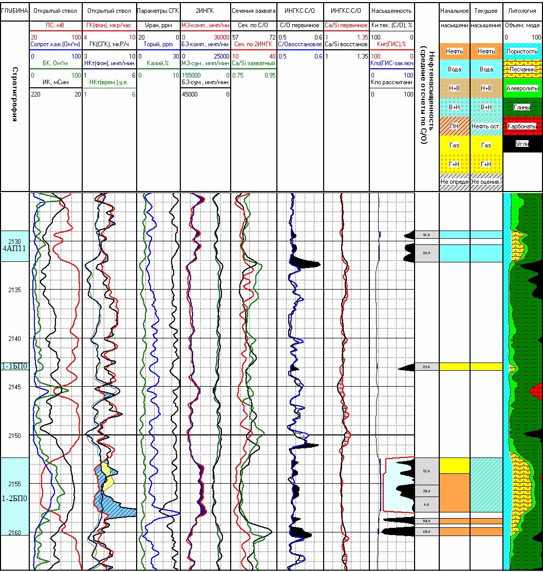 - выделение проницаемых интервалов, оценка характера насыщения и оценка коэффициента нефтегазонасыщенности;