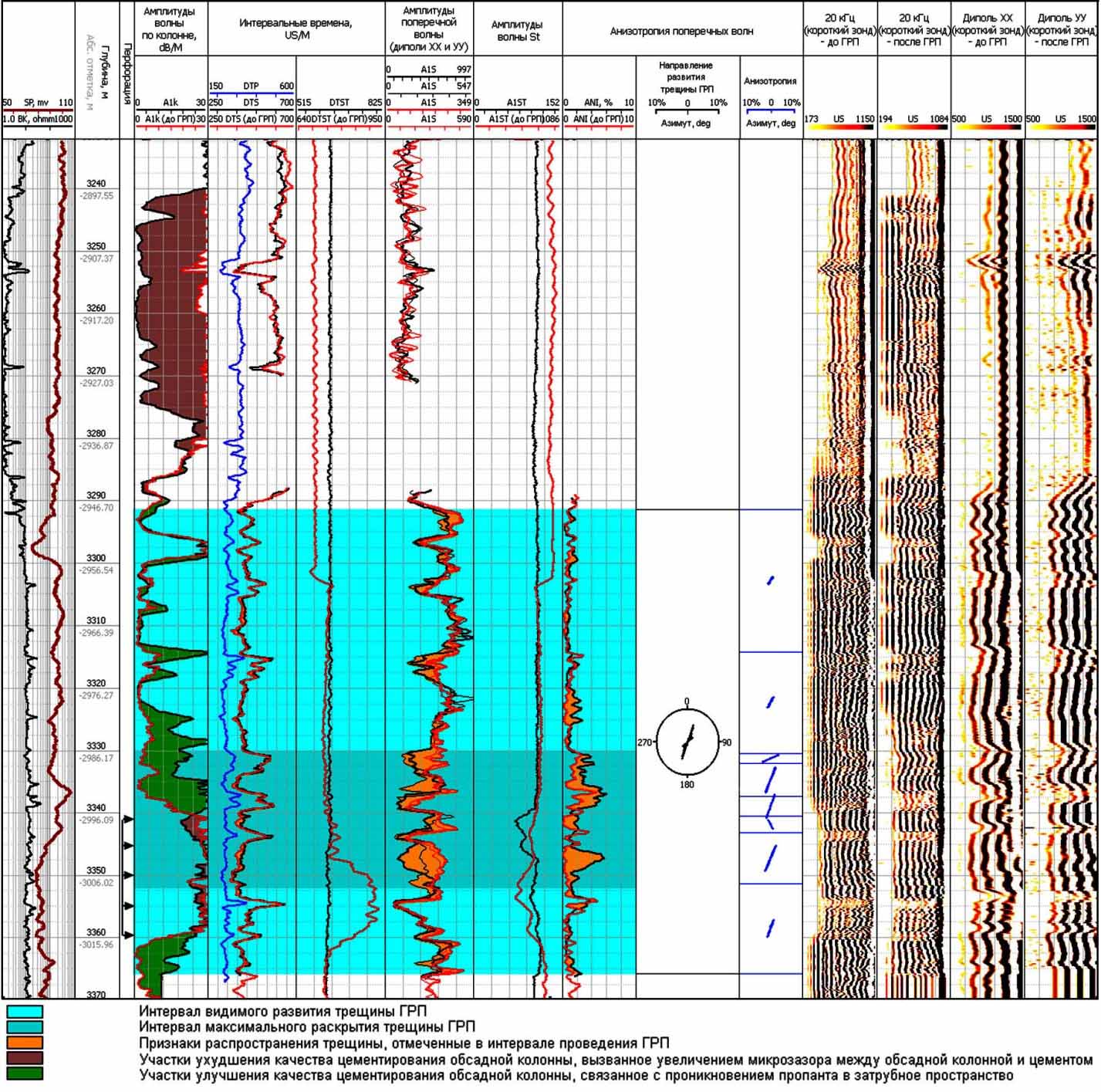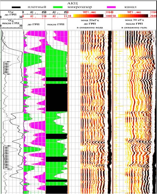 Рис. 1.18. Изменение состояния цементного камня после проведения ГРП, по результатам обработки данных стандартного АКЦ (колонка 1) и двух частотной цементометрии (колонка 2, 3), зарегистрированных до и после проведения работ на скважине