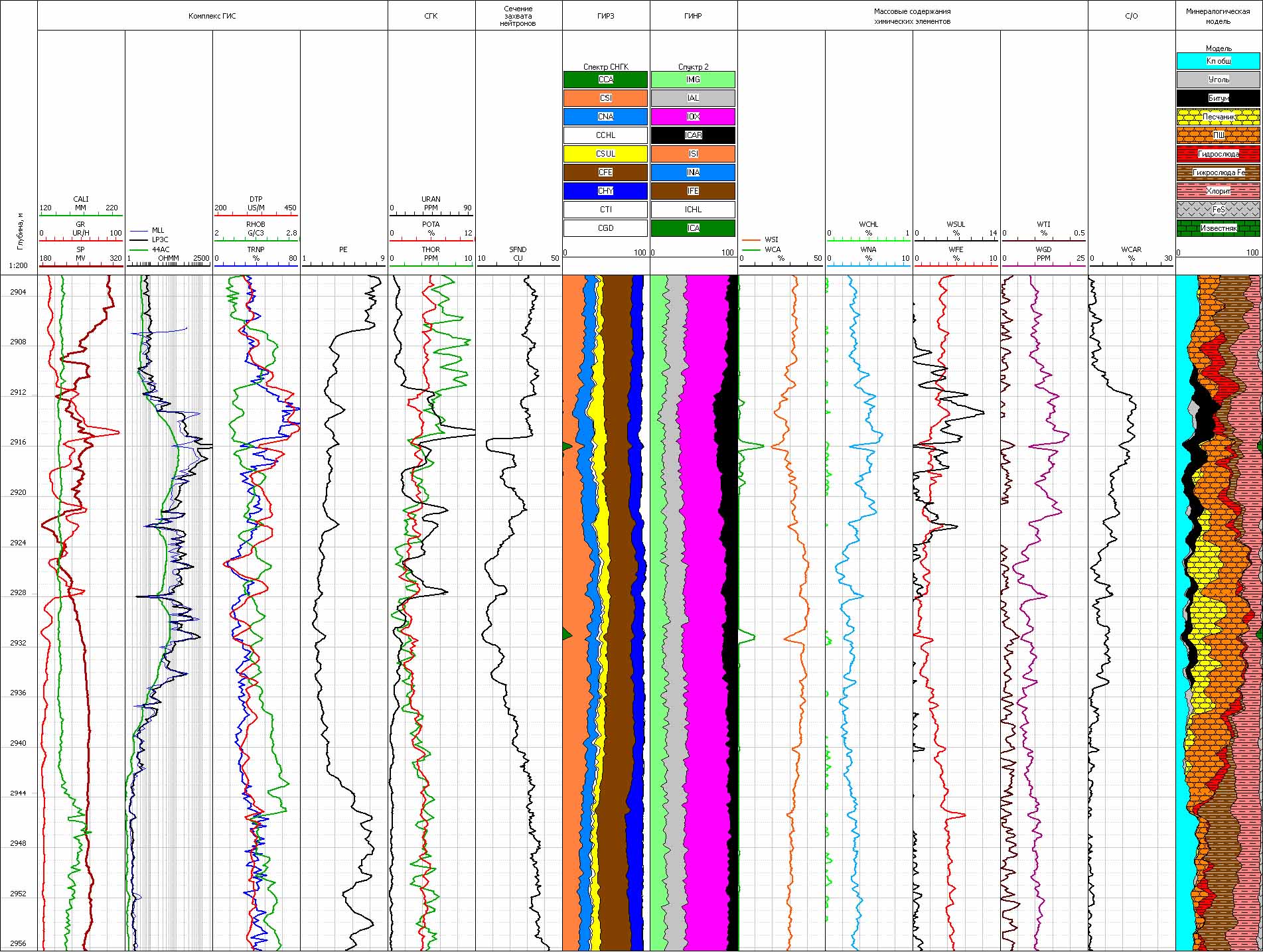 - определение минерального состава скелета породы (глинистости, песчанистости, карбонатности, пиритизации, осолонения и др.), лито-фациальная идентификация пород по данным оценки массовых содержаний элементов;