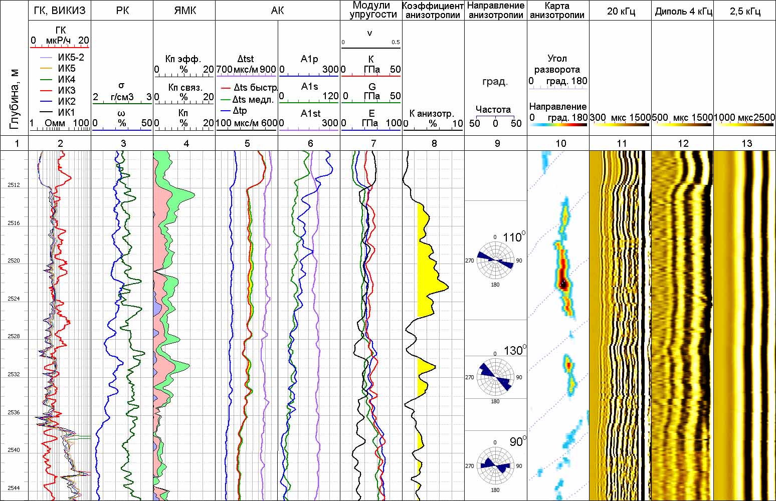 Рис.1.8. Комплексный планшет с результатами обработки прибора АВАК, по определению анизотропии горных пород, совместно с дополнительными данными методов ИК5, ГК, ЯМК, ГГКп и 2ННКт