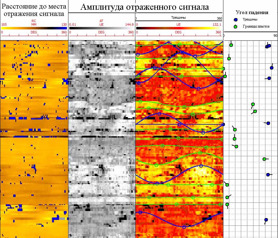 - определение интервалов микрозазоров между колонной и цементом, оценка толщины слоя жидкости между колонной и цементом,каналов в цементном камне.